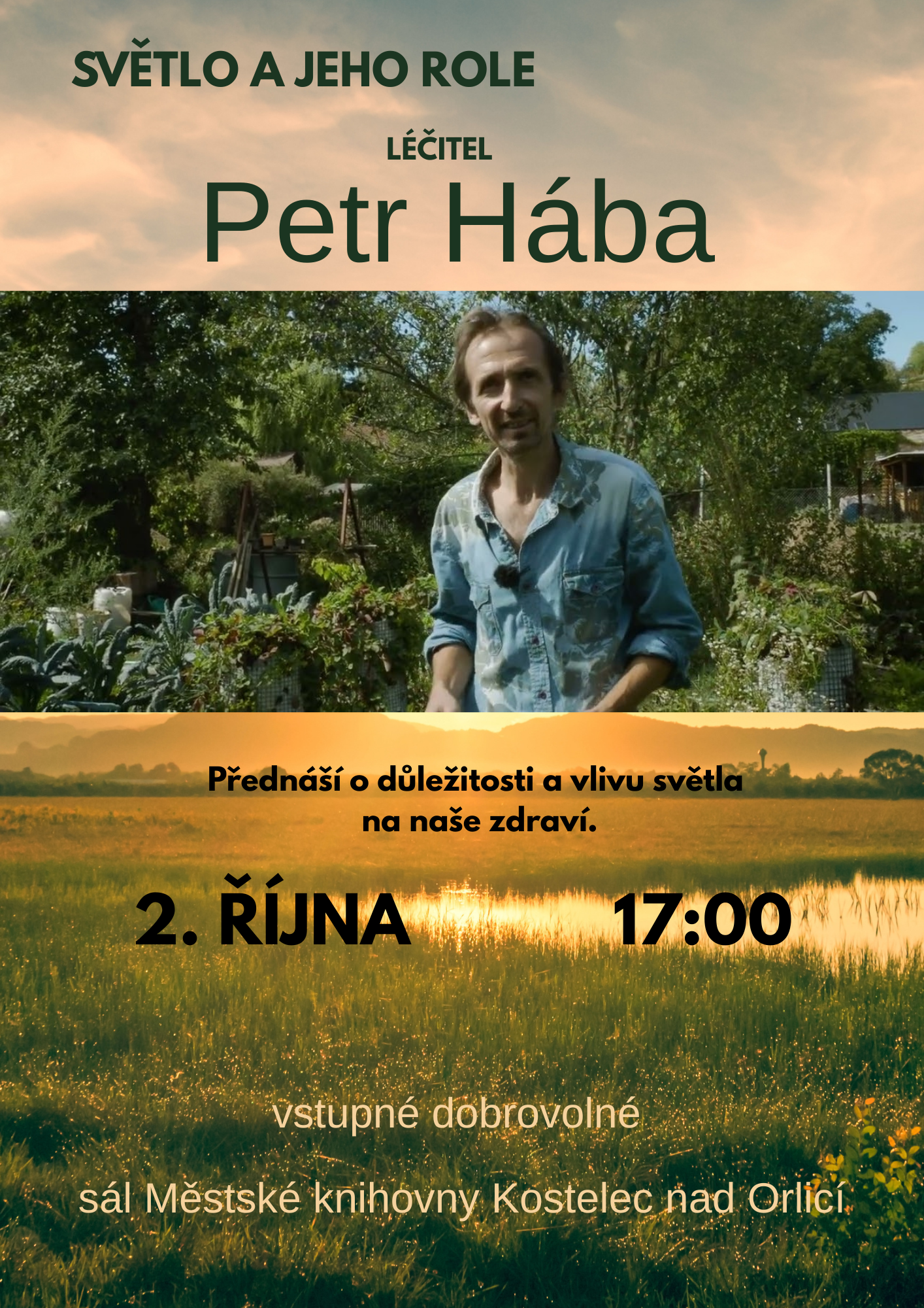 SVĚTLO A JEHO ROLE LÉČITEL PETR HÁBA Přednáší o důležitosti a vlivu světla na naše zdraví. 2. října v 17 hodin vstupné dobrovolné sál Městské knihovny Kostelec nad Orlicí