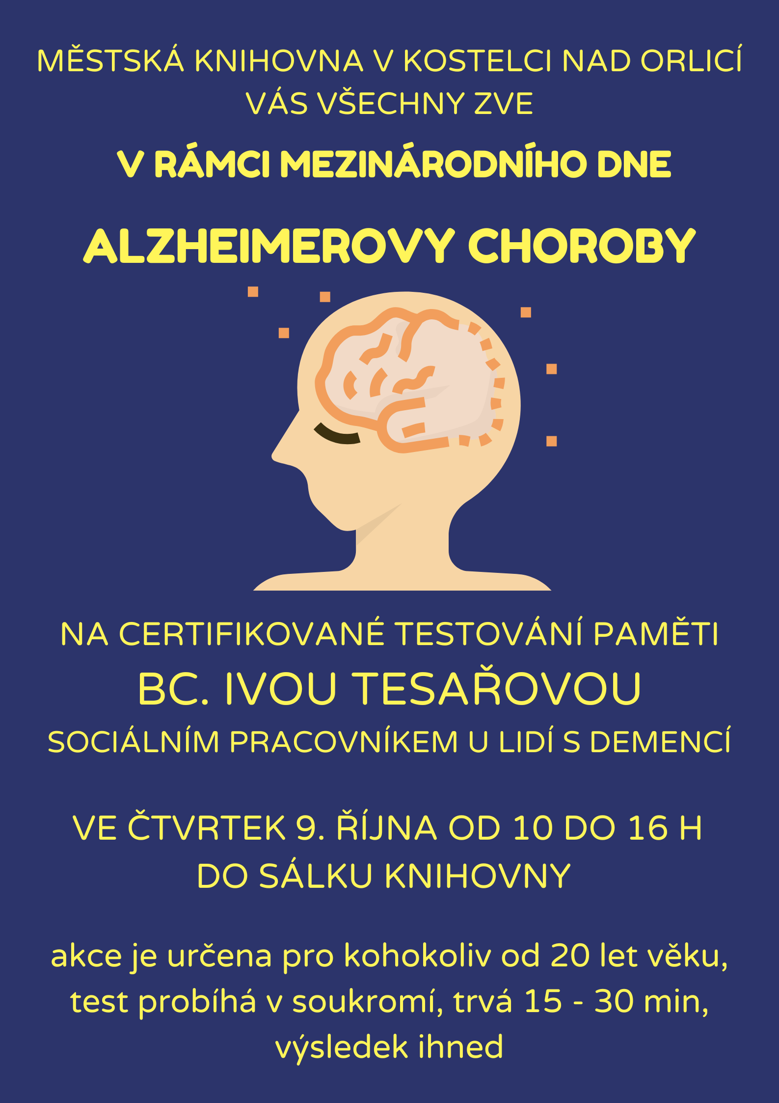 Městská knihovna v Kostelci nad Orlicí vás všechny zve v rámci Mezinárodního dne Alzheimerovy choroby na certifikované testování paměti Bc. Ivou Tesařovou sociálním pracovníkem u lidí s demencí ve čtvrtek 9. října od 10 do 16 h do sálu knihovny akce je určena pro kohokoliv od 20 let věku, test…