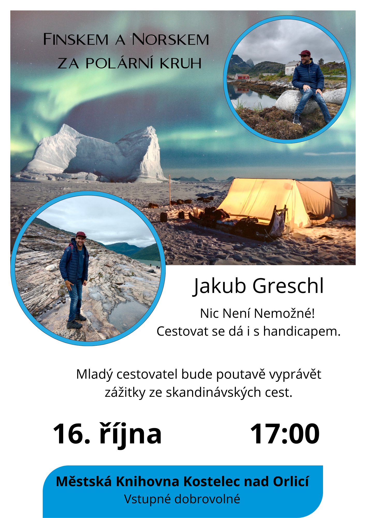 FINSKEM A NORSKEM ZA POLÁRNÍ KRUH Jakub Greschl Nic Není Nemožné! Cestovat se dá i s handicapem. Mladý cestovatel bude poutavě vyprávět zážitky ze skandinávských cest. 16. října 17:00 Městská knihovna Kostelec nad Orlicí Vstupné dobrovolné