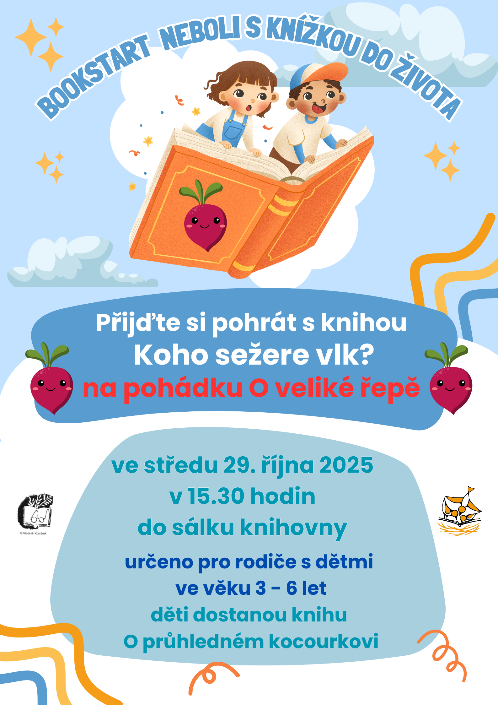 Bookstart neboli S knížkou do života Přijďte si pohrát s knihou Koho sežere vlk? na pohádku O veliké řepě ve středu 29. října 2025 v 15.30 h do sálku knihovny určeno pro rodiče s dětmi ve věku 3 – 6 let děti dostanou knihu O průhledném kocourkovi hlaste se na…