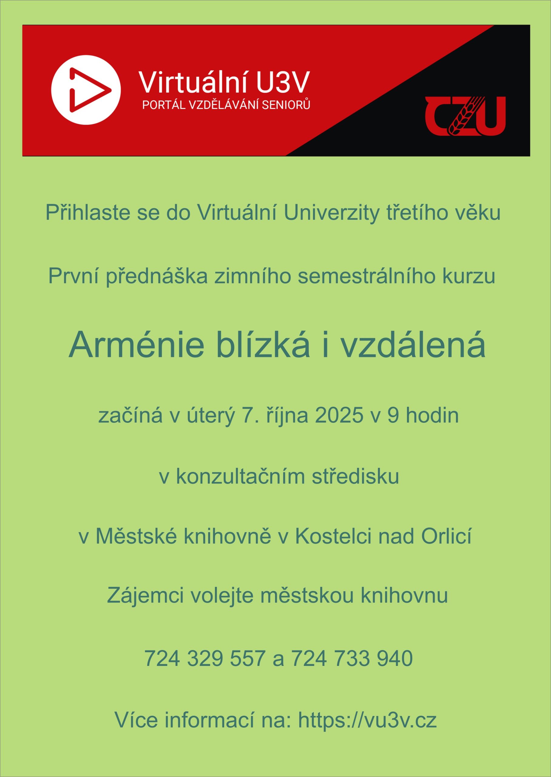 Přihlaste se do Virtuální Univerzity třetího věku. První přednáška zimního semestrálního kurzu Arménie blízká i vzdálená začíná v úterý 7. října 2025 v 9 hodin v konzultačním středisku v Městské knihovně v Kostelci nad Orlicí. Zájemci volejte knihovnu 724 329 557 a 724 733 940. Více informací na https://vu3v.cz