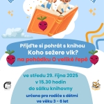 - Bookstart neboli S knížkou do životaAutor: Simona KňourkováBookstart neboli S knížkou do života Přijďte si pohrát s knihou Koho sežere vlk? na pohádku O veliké řepě ve středu 29. října 2025 v 15.30 h do sálku knihovny určeno pro rodiče s dětmi ve věku 3 – 6 let děti dostanou knihu O průhledném kocourkovi hlaste se na emailu: detske@biblio.cz