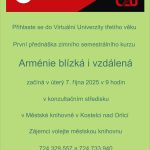 - Arménie blízká i vzdálenáAutor: Simona KňourkováPřihlaste se do Virtuální Univerzity třetího věku. První přednáška zimního semestrálního kurzu Arménie blízká i vzdálená začíná v úterý 7. října 2025 v 9 hodin v konzultačním středisku v Městské knihovně v Kostelci nad Orlicí. Zájemci volejte knihovnu 724 329 557 a 724 733 940. Více informací na https://vu3v.cz